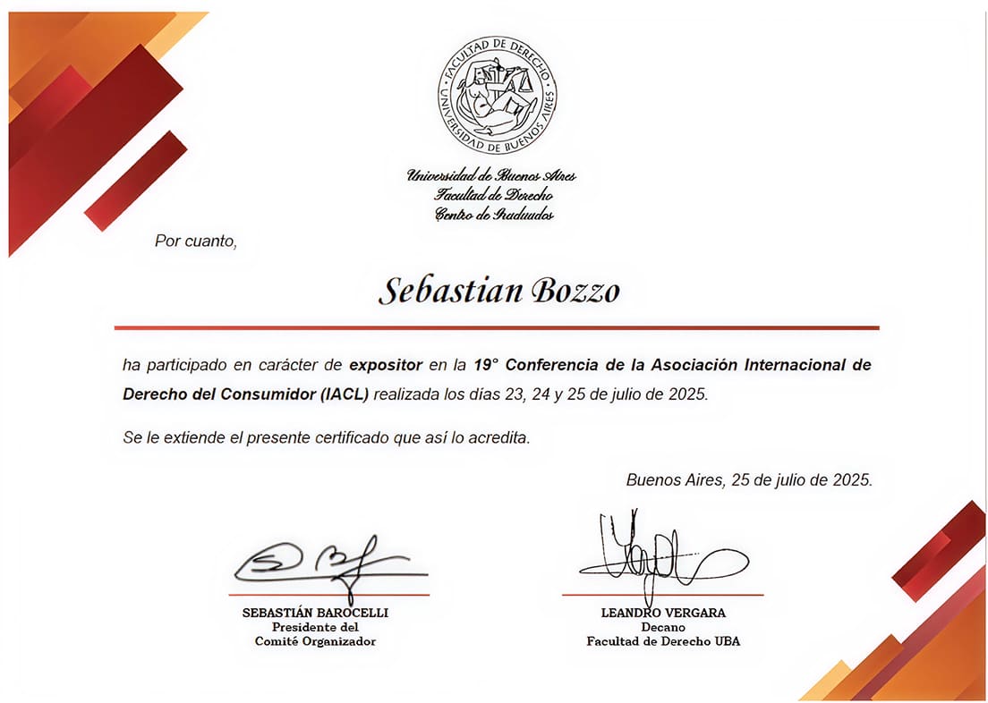 Profesor Sebastián Bozzo Hauri expuso en la 19° Conferencia de la Asociación Internacional de Derecho del Consumidor (IACL) realizada los días 23, 24 y 25 de julio de 2025 en la Universidad de Buenos Aires.