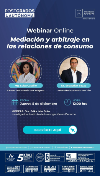 Webinar Online Mediación y Arbitraje en las Relaciones de Consumo. Este Webinar fue organizado por la Universidad Autónoma sede Providencia. El profesor Sebastián Bozzo Hauri participó como expositor