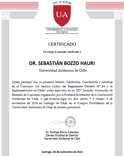 El profesor Sebastián Bozzo Hauri participó como expositor con la ponencia “Mediación, Conciliación y Arbitraje en el Consumo: Un análisis crítico del Reglamento Decreto N°84 y su Implementación en Chile".